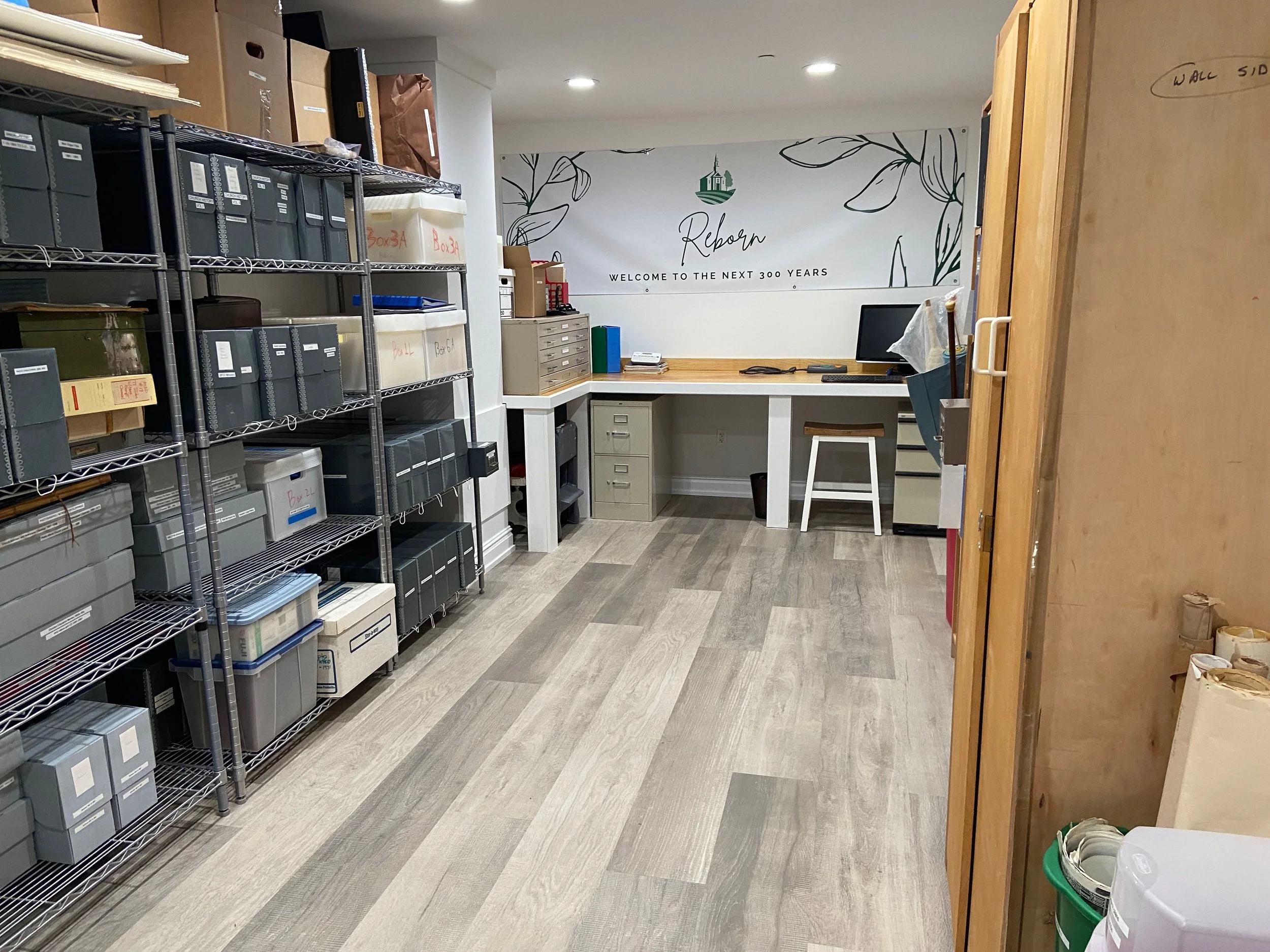 An institution with 300 years of history has a lot to preserve but may not have taken the time to work out how best to do it. What began as dozens of boxes and shopping bags overflowing with paper, files, artifacts, photos, and ephemera ended up as an Archive Room with protective storage and office space to carry on the work of preserving history.