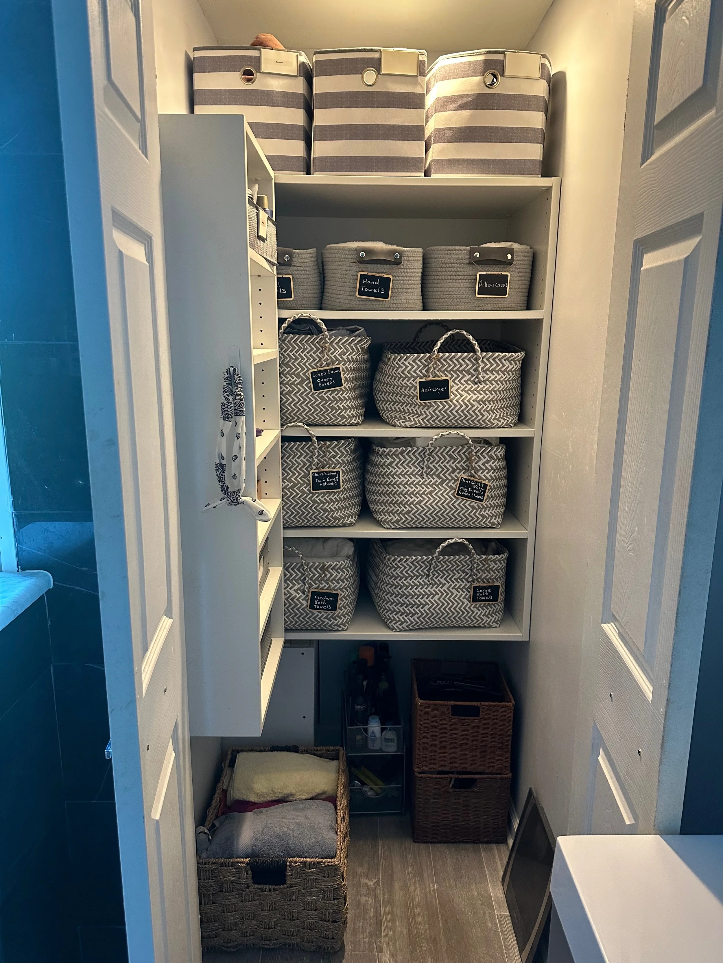 Why do the people who make bed sheets never mark sizes on them? When the linen closet is a jumble, it’s worth taking a couple of hours to identify what goes on which bed, cull worn textiles for recycling, categorize, contain and clearly mark them. Changing the beds is no longer an exercise in frustration!